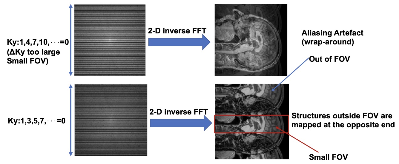 - Cause: Sparse k-space lines in the phase-encoding direction (Δk too large).
