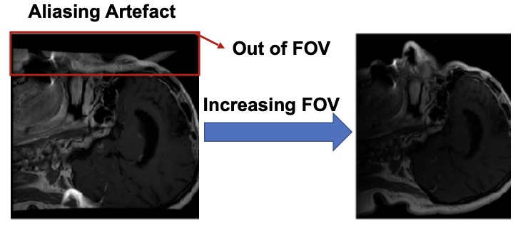 - Effect: Aliasing and spatial mislocalisation, including wrap-around of structures outside the field of view.
