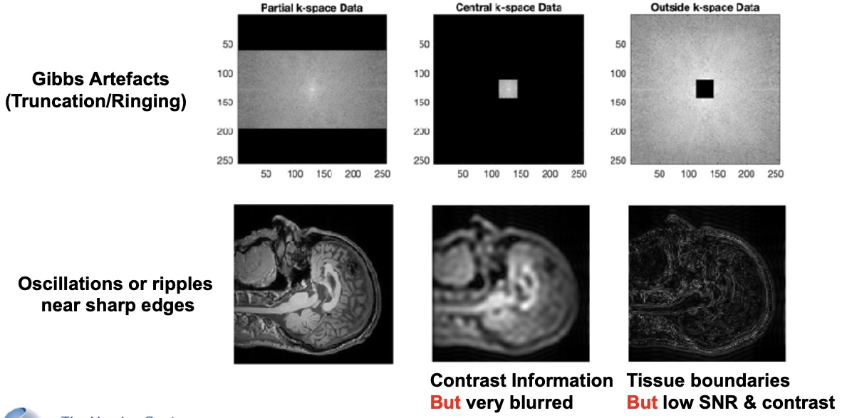 - Effect: Gibbs ringing artefacts near sharp tissue boundaries.